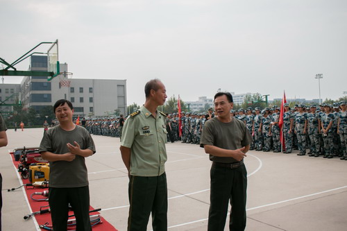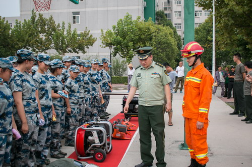 随后武警消防大队刘源参谋组织各连队进行参观学习,向新生普及消防知识。消防队员依次为在场人员介绍了液压扩张装备、液压剪切钳、液压机动泵、照明装备、电锯排烟机、防火服防化服,空气呼吸机等器械。学员们聚精会神,认真学习各种仪器的使用方法,部分新生还亲身体验了一番。