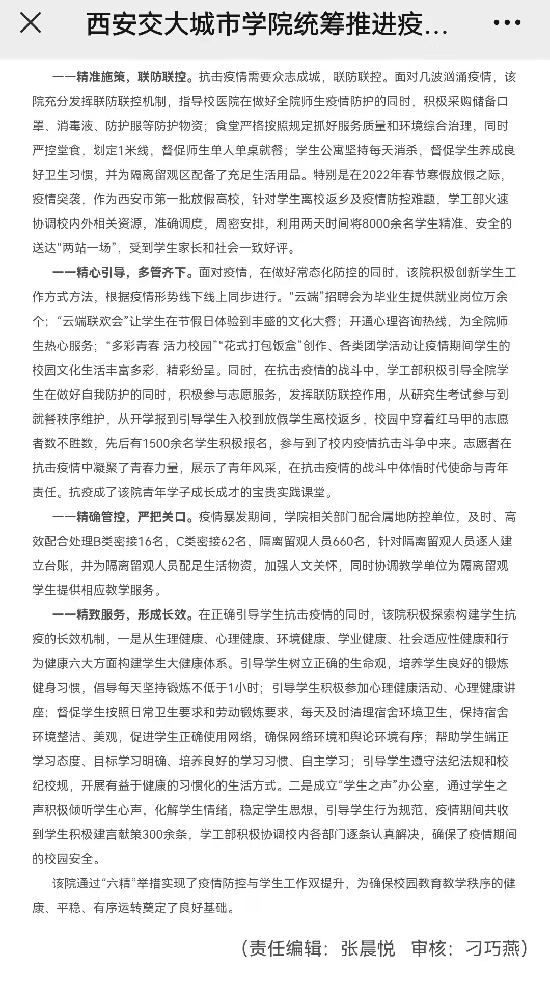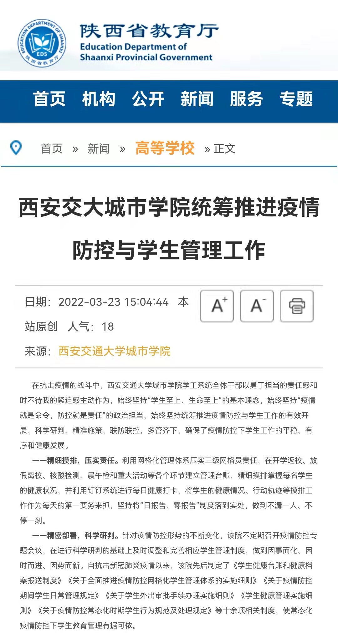 近日,陕西省教育厅报道了学院统筹推进疫情防控与学生管理工作。报道内容及链接如下: