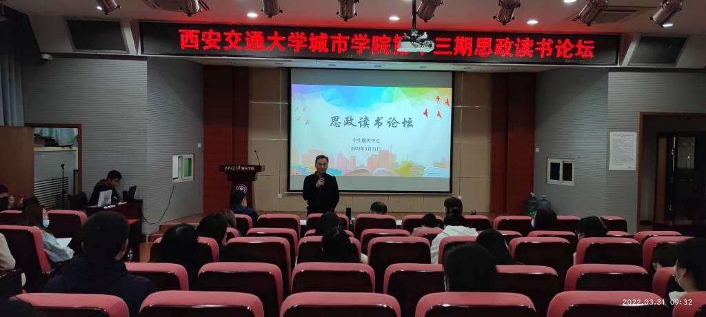 3月31日,西安交通大学城市学院在F100报告厅举办了第十三期思政读书论坛。学院党委书记张爱萍,学生服务中心主任张学堂,副主任辛红伟、马瑞及相关学生工作者参加了读书分享会。