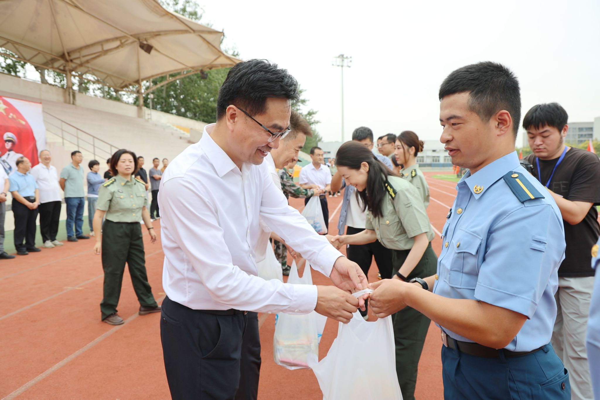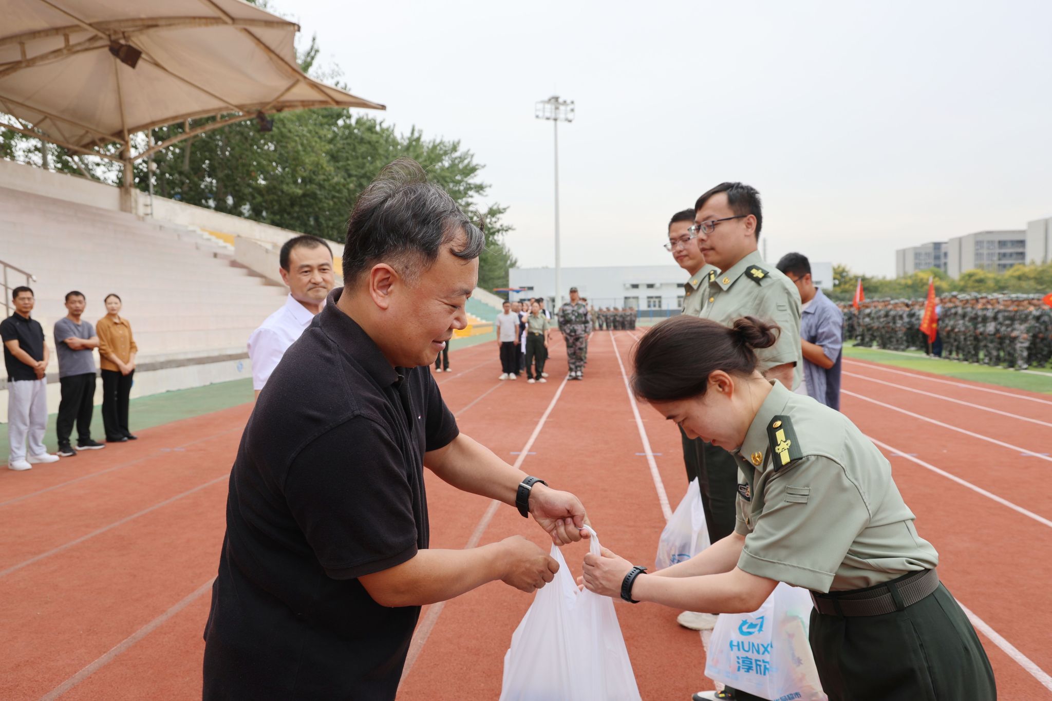 在一阵阵掌声中,学校领导、各二级学院、职能部门负责人为军训教官、指导员、参训学员及后勤保障服务代表发放了慰问品。