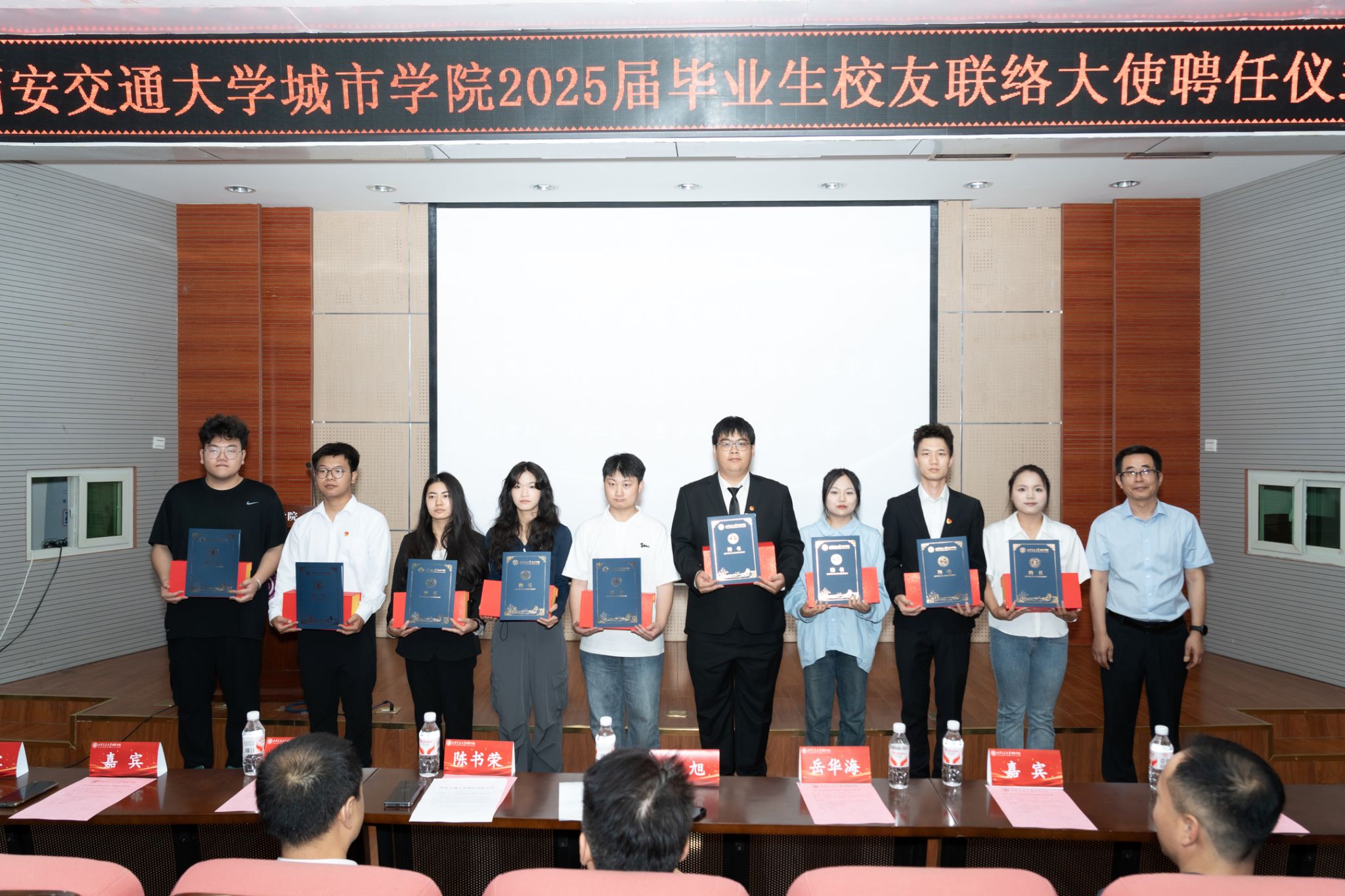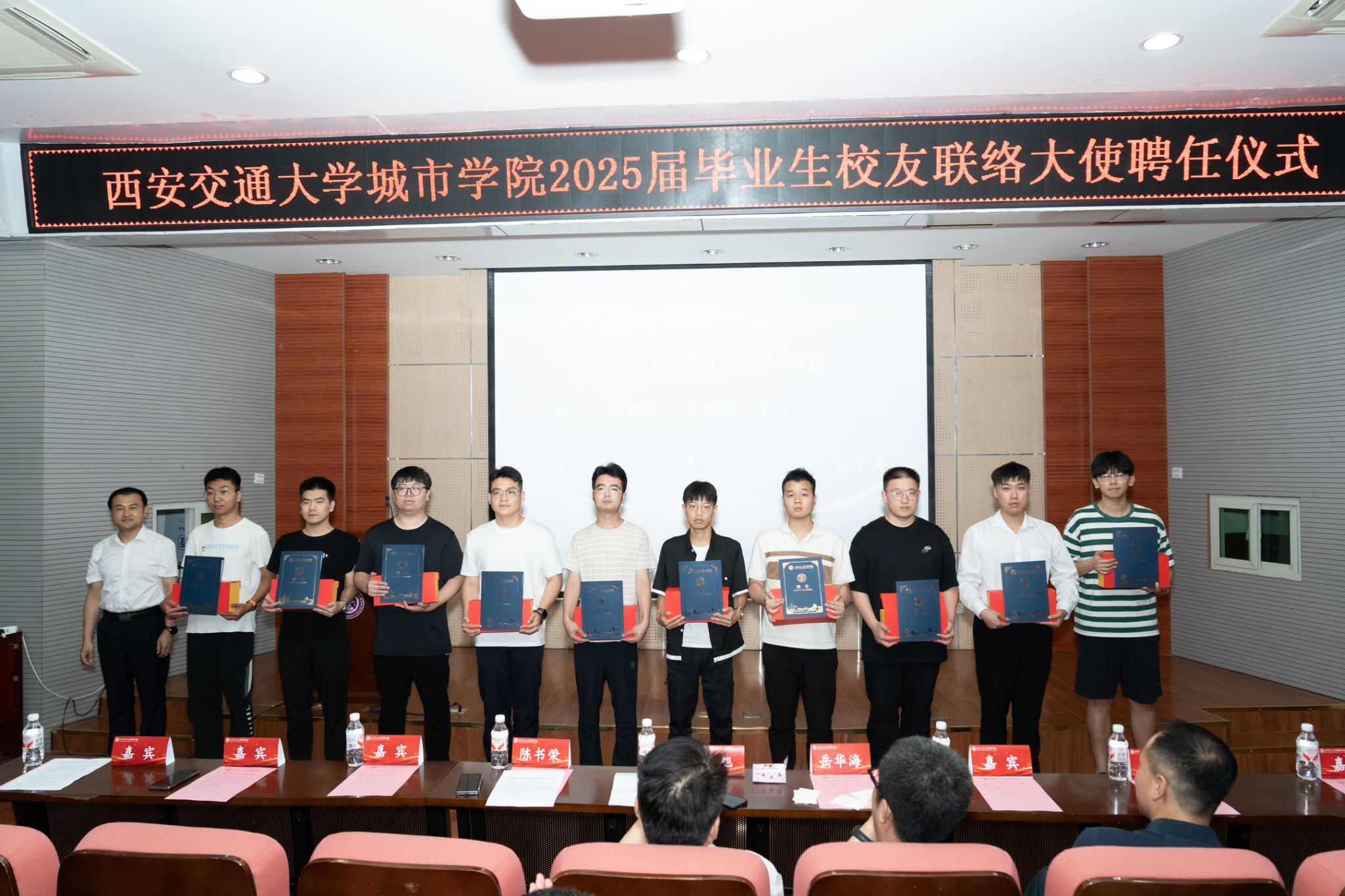 同窗情深,校友谊长。6月25日下午,西安交通大学城市学院2025届毕业生校友联络大使聘任仪式在F100报告厅举行。西安交通大学城市学院副校长(代理校长)朱旭,党委副书记、副校长陈书荣,副校长岳华海,学生工作处处长辛红伟、副处长姚敏、张福全,各二级学院学工负责人以及125名校友联络大使出席此次仪式。会议由学生工作处处长辛红伟主持。