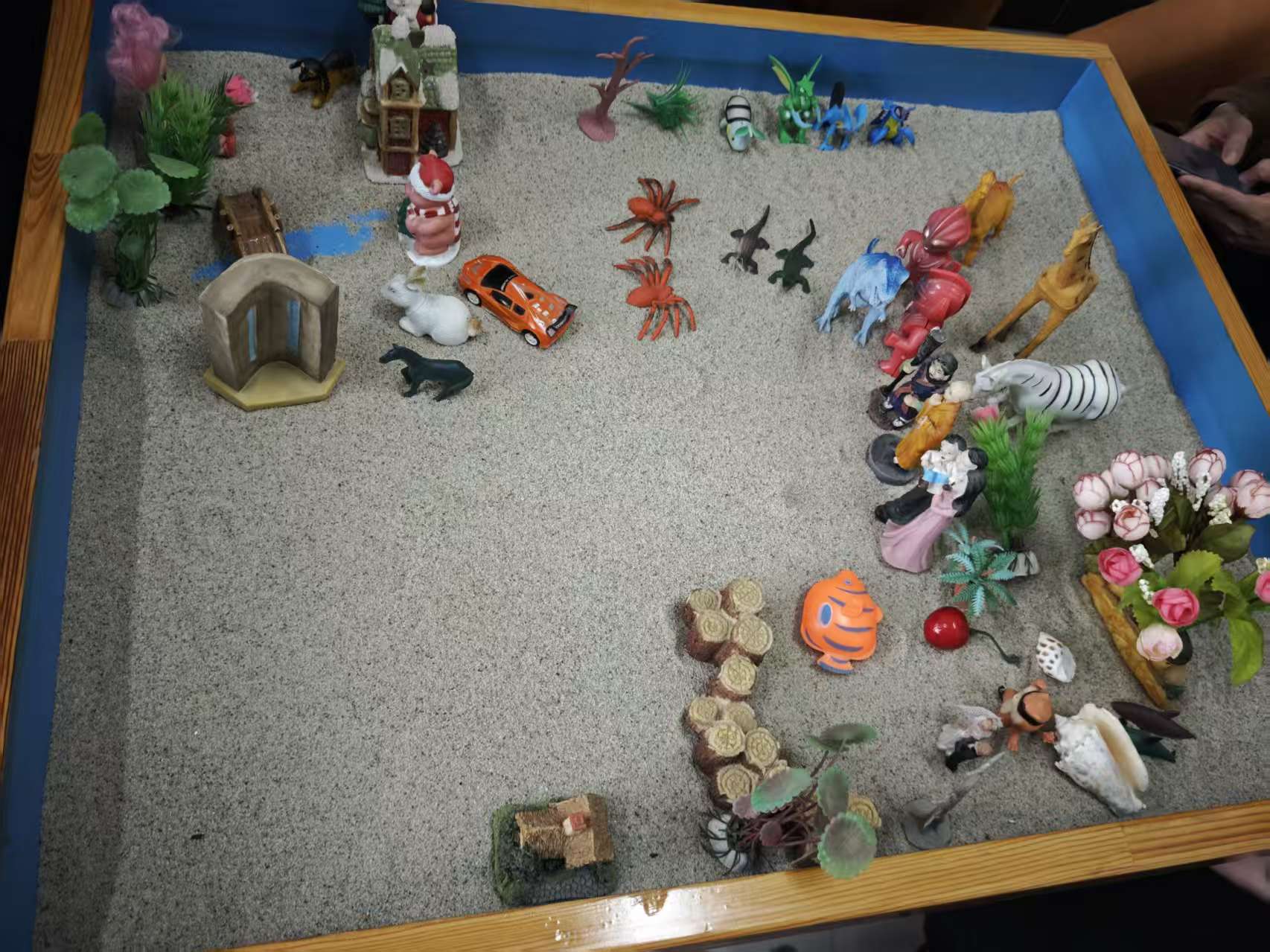 随后,小组成员依次在沙盘中挑选沙具、摆放造型,共同完成一幅幅富有象征意义的沙盘作品。过程中,辅导员们沉浸于沙与具的互动中,感受指尖触沙的放松,体会内心世界的自然流露。在最后的分享环节,辅导员围绕沙盘作品的创作过程与内心感受展开交流。通过真诚开放地分享,团队成员之间建立起更深层次的信任与默契,现场氛围温暖而充满力量。