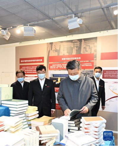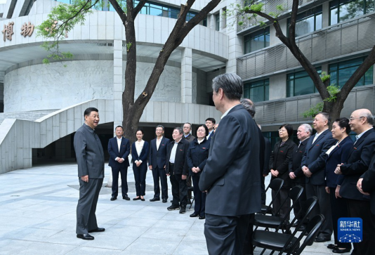 4月25日上午,中共中央总书记、国家主席、中央军委主席习近平来到中国人民大学考察调研。这是习近平在博物馆了解学校近年来教学科研成果等情况。新华社记者 谢环驰 摄