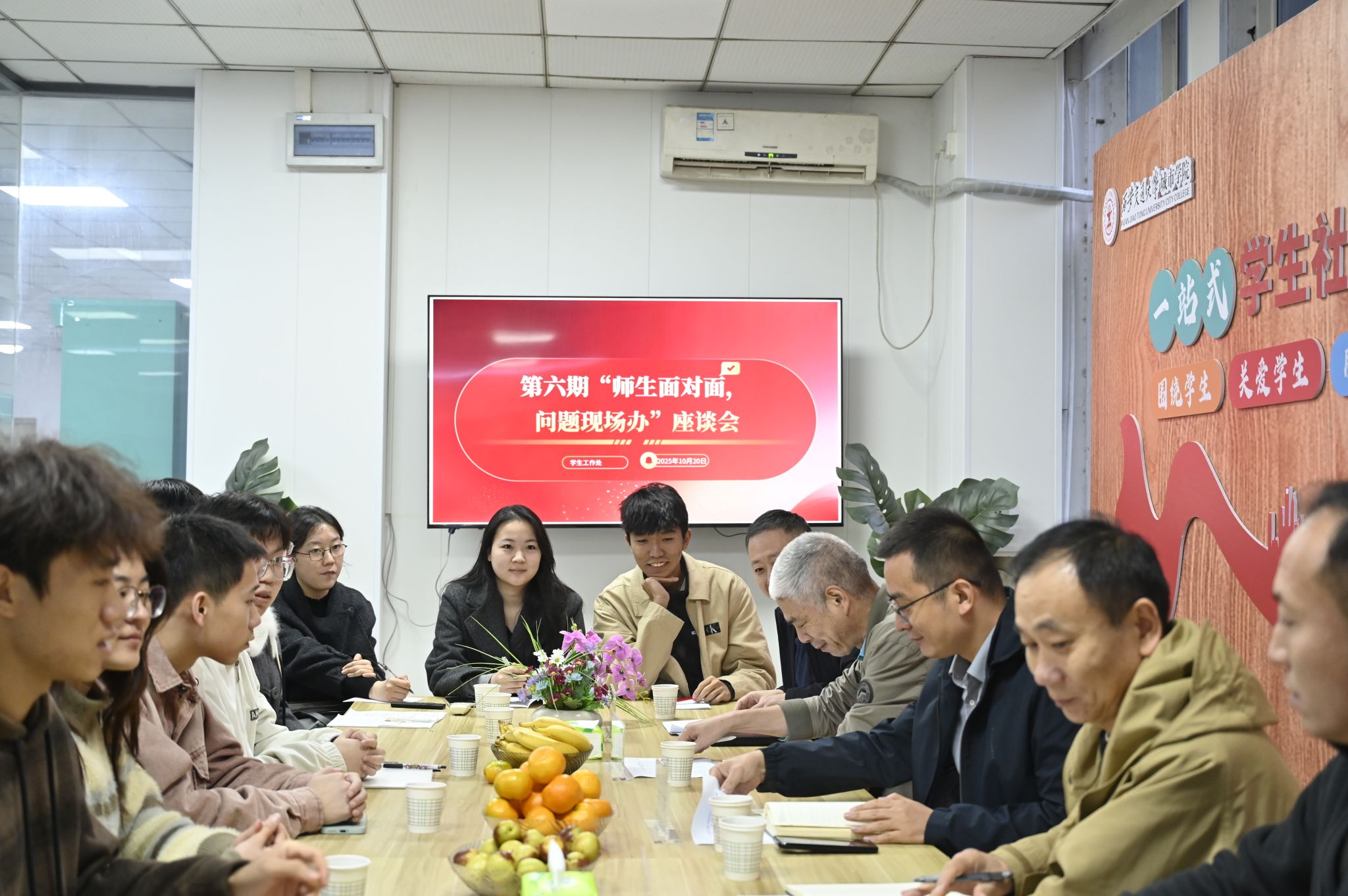为深入落实“我为学生办实事”主题活动,推动学生参与学校治理,切实解决同学们学习生活中的困惑与问题,10月20日,学校在5号学生公寓“一站式”学生社区一楼多功能厅举办第六期“师生面对面,问题现场办”座谈会。校长助理、行政人事部部长姬志国,校长助理、财务处处长马江涛,图书馆馆长张勇,学生工作处处长辛红伟、副处长张福全、学生教育管理科副科长吴江菊及15名学生代表参会。会议由学生工作处处长辛红伟主持。